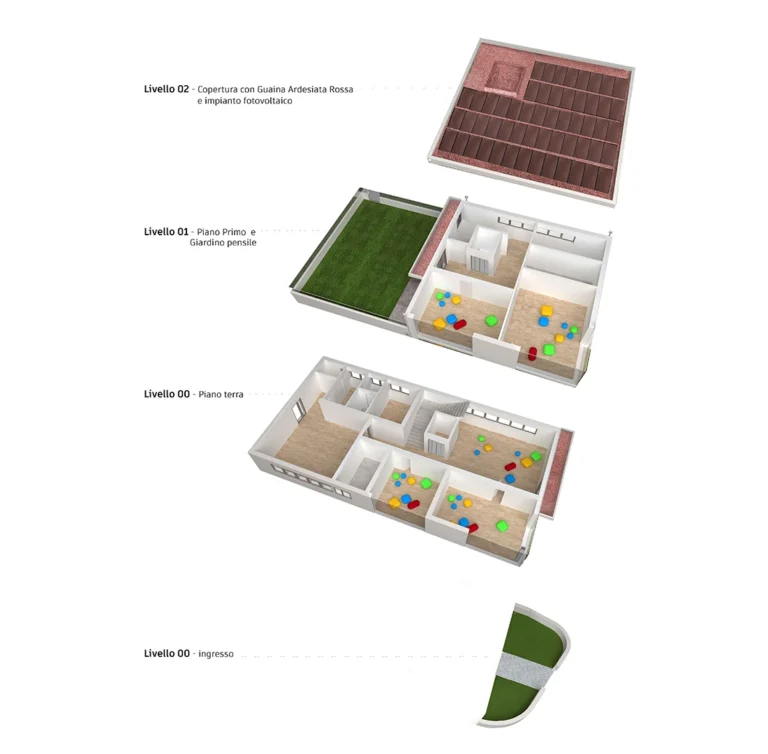 Per soddisfare gli obiettivi di progetto si è ritenuto che la scelta di forme semplici, con un rimando diretto a quelle di un’abitazione, fosse la più adatta per i bambini della fascia d’età della scuola dell’infanzia.